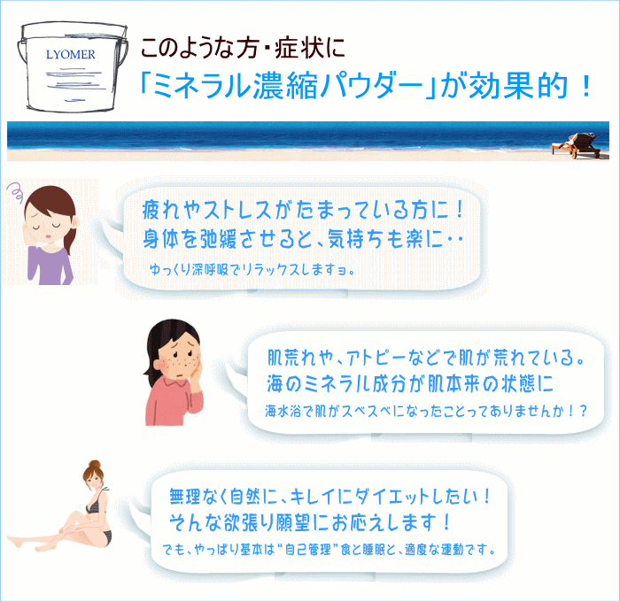 ●体内に必要なミネラル、微量元素を含有 ●海水を特殊製法により塩化ナトリウム分のみ30%カット ●ぬるめなお湯でゆっくり入浴することにより、肌にミネラルが補給され、同時に浸透圧現象により体内のミネラルバランスを図る ●湯上りはしっとりスベスベ。