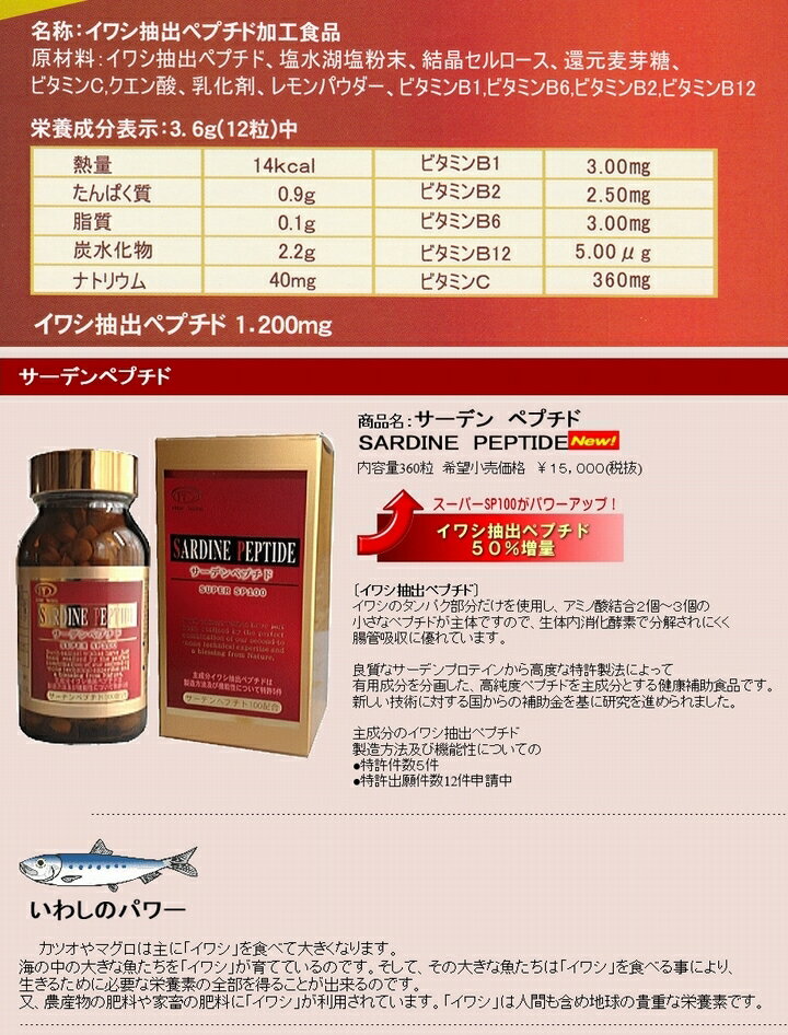 サーデン ペプチド スーパーSP100の特徴 名称 イワシ抽出ペプチド加工食品 内容量 108g(300mg×360粒) 原材料 イワシ抽出ペプチド、塩水湖塩粉末、結晶セルロース、還元麦芽糖、ビタミンC、クエン酸、乳化剤、レモンパウダー、ビタミンB1、ビタミンB6、ビタミンB2、ビタミンB12 お召し上がり方 1日12粒を目安に、2〜3回に分けて、水かぬるま湯で服用下さい。